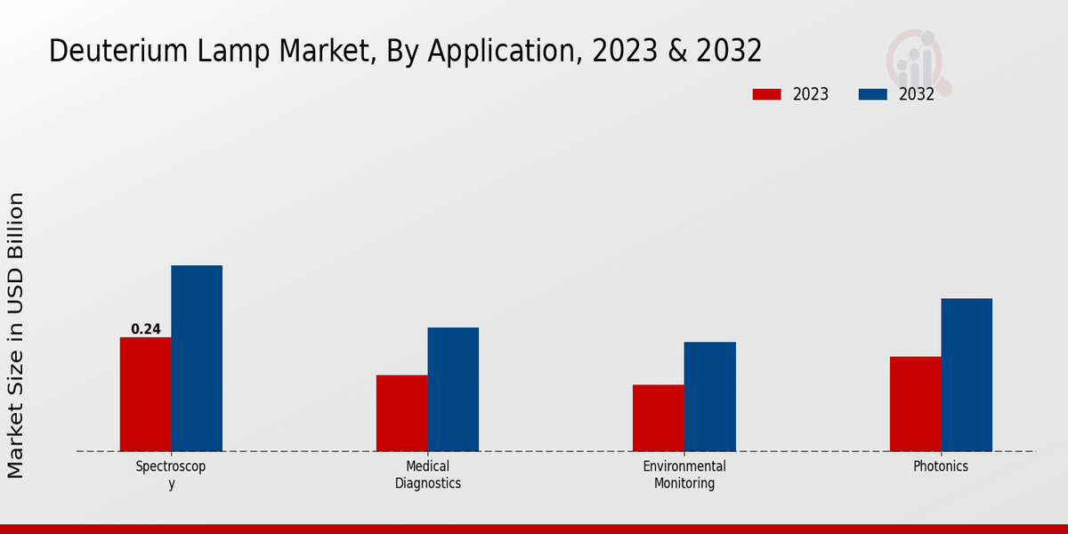 El mercado de lámparas de deuterio está experimentando un crecimiento constante, y el segmento de aplicaciones desempeña un papel fundamental en este desarrollo, contribuyendo significativamente a la dinámica general del mercado. . En 2023, este mercado estaba valorado en 0,74 mil millones de dólares y se prevé que alcance los 1,2 mil millones de dólares en 2032, lo que refleja un sólido potencial de crecimiento. Las diversas aplicaciones de las lámparas de deuterio abarcan varios sectores esenciales, en particular la espectroscopia, el diagnóstico médico, la monitorización ambiental y la fotónica. La aplicación Espectroscopia representó una parte sustancial del mercado, con una valoración reportada de 0,24 USD Mil millones en 2023 y se espera que crezca a 0,39 mil millones de dólares en 2032. Este predominio se atribuye a la creciente adopción de técnicas de espectroscopia en investigación y análisis. laboratorios, que dependen en gran medida de fuentes de luz de alta intensidad para realizar mediciones precisas.