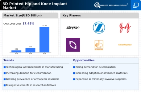 The increasing prevalence of orthopedic disorders globally drives demand within the Global 3D Printed Hip and Knee Implant Market Industry. Conditions such as osteoarthritis and rheumatoid arthritis are becoming more common, particularly among aging populations. This demographic shift indicates a growing need for effective treatment options, including 3D printed implants that offer enhanced compatibility and longevity. As the market adapts to these needs, it is anticipated to expand significantly, potentially reaching 33.8 USD Billion by 2035. The ability of 3D printed implants to address complex anatomical challenges further positions them as a preferred choice in orthopedic surgeries.