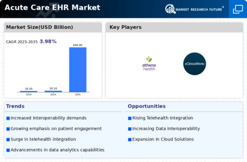The Global Acute Care EHR Market Industry experiences a notable surge in demand for enhanced patient care. Healthcare providers increasingly recognize the need for efficient data management systems that facilitate real-time access to patient information. This trend is driven by the growing emphasis on patient-centered care, which aims to improve treatment outcomes and patient satisfaction. As a result, the market is projected to reach 20.1 USD Billion in 2024, reflecting a significant investment in EHR systems that streamline workflows and enhance communication among healthcare professionals.