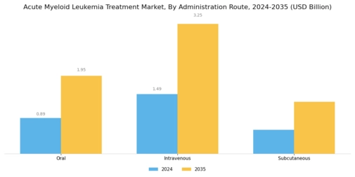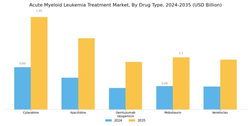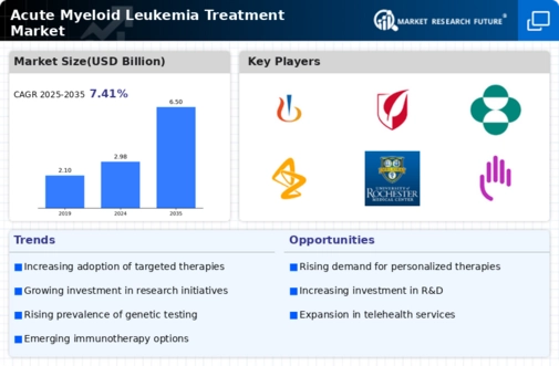The increasing prevalence of Acute Myeloid Leukemia (AML) globally is a primary driver for the Global Acute Myeloid Leukemia Treatment Market Industry. According to health statistics, the incidence rate of AML has been on the rise, with an estimated 21,000 new cases reported annually in the United States alone. This growing patient population necessitates the development of innovative treatment options, thereby propelling market growth. As the global healthcare landscape evolves, the demand for effective therapies is expected to escalate, contributing to the projected market value of 2.98 USD Billion in 2024 and potentially reaching 6.5 USD Billion by 2035.