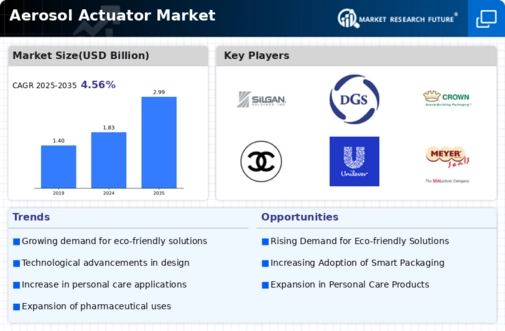 Technological advancements in aerosol actuator design and functionality are propelling the Global Aerosol Actuator Market Industry forward. Innovations such as improved spray patterns, enhanced control mechanisms, and eco-friendly propellants are becoming increasingly prevalent. These advancements not only enhance product performance but also align with regulatory standards aimed at reducing environmental impact. As a result, manufacturers are investing in research and development to create more efficient actuators. This focus on technology is expected to drive market growth, with projections indicating a compound annual growth rate of 4.57% from 2025 to 2035, ultimately leading to a market value of 2.99 USD Billion by 2035.