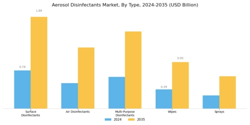 As per Market Research Future Analysis, the Global Aerosol Disinfectants Market was valued at 2.25 USD Billion in 2022 and is projected to grow to 4.92 USD Billion by 2032, reflecting a CAGR of 8.13% from 2024 to 2032. The market is driven by increasing health awareness and demand for hygiene products, particularly in sectors like healthcare, education, and hospitality. The rise in infectious diseases has heightened the focus on sanitation, making aerosol disinfectants essential in daily cleaning routines. Additionally, the shift towards eco-friendly formulations and the growth of e-commerce platforms are creating new opportunities for market expansion.