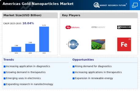 The Global Americas Gold Nanoparticles Market Industry benefits from the growing awareness of the advantages associated with nanotechnology. As industries recognize the potential of gold nanoparticles in enhancing product performance and efficiency, there is an increasing inclination to adopt these materials. Educational initiatives and outreach programs are instrumental in disseminating knowledge about the applications and benefits of gold nanoparticles. This heightened awareness is likely to stimulate demand across various sectors, including healthcare, electronics, and environmental applications, thereby contributing to the overall growth of the market.