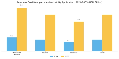 The Global Americas Gold Nanoparticles Market Industry is poised for growth due to the expansion of electronics and photonics sectors. Gold nanoparticles are employed in various electronic applications, including sensors, conductive inks, and photovoltaic cells. Their excellent electrical conductivity and optical properties facilitate the development of advanced electronic devices. The integration of gold nanoparticles in photonic devices enhances light absorption and emission, leading to improved performance. As the demand for miniaturized and efficient electronic components rises, the market is likely to benefit from this trend, potentially reaching a valuation of 9.7 USD Billion by 2035.