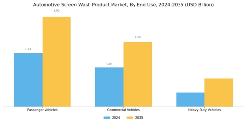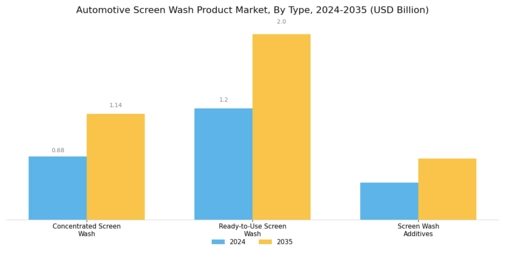 Consumer awareness regarding vehicle maintenance is a significant driver for the Global Automotive Screen Wash Product Market Industry. As vehicle owners increasingly recognize the importance of maintaining optimal visibility through clean windshields, the demand for screen wash products rises. Educational campaigns and automotive service providers play a crucial role in promoting the benefits of regular maintenance, including the use of quality screen wash solutions. This heightened awareness is expected to contribute to a steady growth rate, with projections indicating a CAGR of 4.99% from 2025 to 2035, further solidifying the market's expansion.