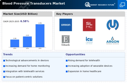 The increasing prevalence of hypertension globally drives the Global Blood Pressure Transducers Market Industry. As per recent health statistics, approximately 1.13 billion people worldwide are living with hypertension, which necessitates regular monitoring. This growing patient population is likely to boost demand for blood pressure transducers, which are essential for accurate and timely blood pressure measurements. The market is projected to reach 2.23 USD Billion in 2024, reflecting the urgent need for effective management of hypertension. Healthcare providers are increasingly adopting advanced transducer technologies to enhance patient outcomes, thereby propelling market growth.