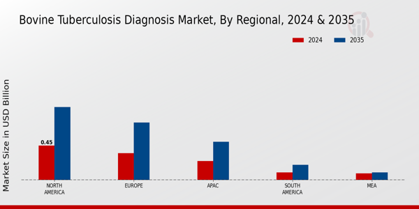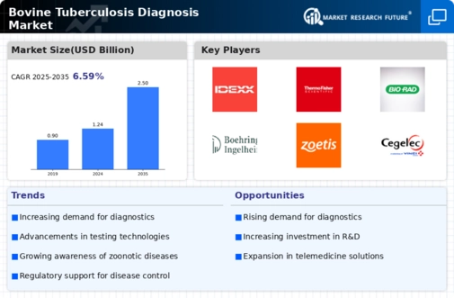 The increasing prevalence of bovine tuberculosis globally drives the Global Bovine Tuberculosis Diagnosis Market Industry. In many regions, the incidence of this disease has been alarming, affecting livestock health and productivity. For instance, countries like the United States and the United Kingdom have reported significant cases, prompting stricter regulations and testing protocols. This trend necessitates advanced diagnostic tools to manage and control the disease effectively. As a result, the market is projected to reach 1.24 USD Billion in 2024, reflecting the urgent need for efficient diagnostic solutions to combat the rising threat of bovine tuberculosis.
