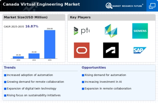 The virtual engineering market in Canada is characterized by a dynamic competitive landscape, driven by rapid technological advancements and increasing demand for digital solutions across various sectors. Key players such as Siemens (CA), Autodesk (CA), and Dassault Systemes (CA) are at the forefront, each adopting distinct strategies to enhance their market positioning. Siemens (CA) emphasizes innovation through its digital twin technology, which integrates real-time data analytics to optimize engineering processes. Meanwhile, Autodesk (CA) focuses on expanding its cloud-based solutions, facilitating collaboration and efficiency in design workflows. Dassault Systemes (CA) leverages its 3D modeling capabilities to cater to industries ranging from aerospace to healthcare, thereby shaping a competitive environment that prioritizes technological integration and customer-centric solutions.