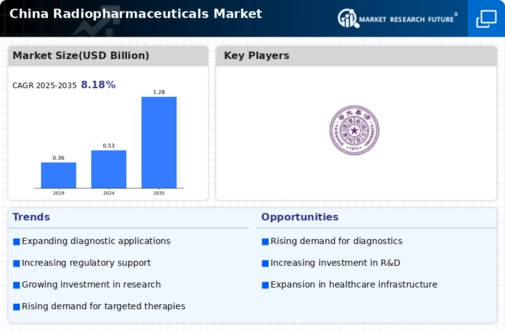The rising incidence of cancer in China is a pivotal driver for the china radiopharmaceuticals market. According to the National Cancer Center of China, cancer cases are projected to reach approximately 4.6 million by 2025. This alarming trend necessitates advanced diagnostic and therapeutic solutions, which radiopharmaceuticals provide. The growing prevalence of various cancers, including lung, breast, and colorectal cancers, underscores the urgent need for effective imaging and treatment options. As healthcare providers seek to enhance patient outcomes, the demand for radiopharmaceuticals is likely to surge, thereby propelling market growth. Furthermore, the integration of radiopharmaceuticals in personalized medicine approaches may further stimulate the market, as tailored therapies become increasingly essential in oncology. Thus, the increasing incidence of cancer serves as a significant catalyst for the expansion of the china radiopharmaceuticals market.