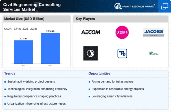 The Civil Engineering Consulting Services Market is characterized by a dynamic competitive landscape, driven by factors such as urbanization, infrastructure development, and sustainability initiatives. Major players like AECOM (US), WSP Global Inc. (CA), and Jacobs Engineering Group (US) are strategically positioned to leverage these growth drivers. AECOM (US) focuses on digital transformation and innovative engineering solutions, while WSP Global Inc. (CA) emphasizes sustainability and environmental stewardship in its projects. Jacobs Engineering Group (US) has adopted a strategy centered on mergers and acquisitions to enhance its service offerings and expand its global footprint. Collectively, these strategies contribute to a competitive environment that is increasingly focused on technological advancement and sustainable practices.In terms of business tactics, companies are localizing their operations to better serve regional markets and optimize supply chains for efficiency. The market structure appears moderately fragmented, with a mix of large multinational firms and smaller regional players. This fragmentation allows for diverse service offerings and competitive pricing, although the influence of key players remains substantial in shaping market trends and standards.