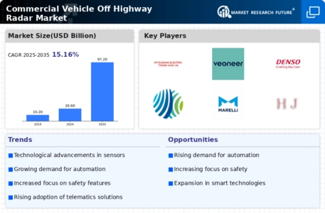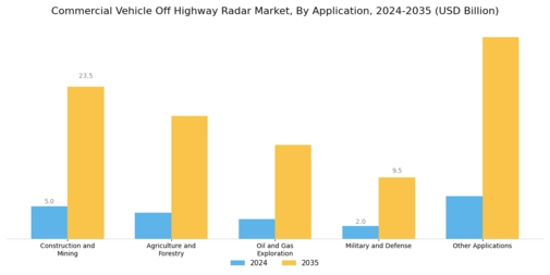 The trend towards automation in the construction and agriculture sectors is significantly impacting the Global Commercial Vehicle Off Highway Radar Market Industry. As companies seek to improve productivity and reduce labor costs, the integration of radar systems into off-highway vehicles is becoming more common. These systems enable features such as automated navigation and obstacle detection, which are essential for autonomous operations. The increasing demand for automated solutions is expected to propel the market, with a projected compound annual growth rate of 15.16% from 2025 to 2035, as businesses invest in technologies that enhance operational efficiency.