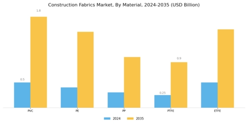 The rapid pace of urbanization and infrastructure development across the globe is a key driver for the Global Construction Fabrics Market Industry. As urban populations continue to swell, the demand for housing, transportation, and public facilities escalates, necessitating the use of high-performance construction fabrics. Governments and private sectors are investing heavily in infrastructure projects, which in turn fuels the need for durable and versatile materials. This trend is likely to sustain the market's growth trajectory, with projections indicating a rise to 1.95 USD Billion in 2024 and a potential increase to 7.25 USD Billion by 2035, underscoring the critical role of construction fabrics in modern development.