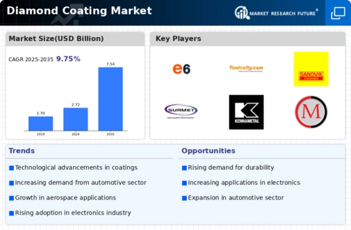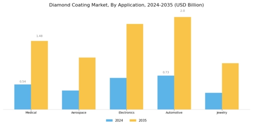 The Global Diamond Coating Market Industry is experiencing heightened demand driven by the aerospace and automotive sectors. These industries require advanced materials that offer superior wear resistance and thermal stability. For instance, diamond coatings are utilized in cutting tools and engine components, enhancing performance and longevity. As the aerospace sector anticipates a significant increase in aircraft production, the need for durable coatings is expected to rise. This trend aligns with projections indicating that the Global Diamond Coating Market will reach 2.72 USD Billion in 2024, reflecting a robust growth trajectory fueled by these industrial applications.