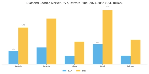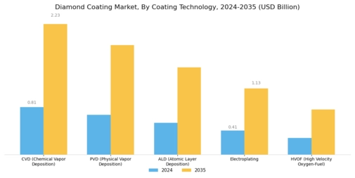 The Global Diamond Coating Market Industry is witnessing expansion into the medical devices sector, where precision and biocompatibility are paramount. Diamond coatings are being utilized in surgical instruments and implants, enhancing their performance and longevity. The unique properties of diamond, such as biocompatibility and resistance to wear, make it an ideal choice for medical applications. As the healthcare industry continues to innovate and demand high-performance materials, the adoption of diamond coatings is expected to increase, contributing to the overall growth of the market.