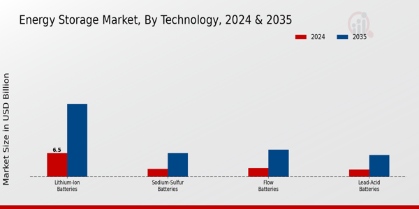 Government policies and incentives are playing a pivotal role in shaping the Global Energy Storage Market Industry. Many governments worldwide are implementing supportive regulations and financial incentives to promote energy storage adoption. These measures include tax credits, grants, and subsidies aimed at reducing the financial barriers associated with energy storage systems. Such initiatives not only encourage investment in energy storage technologies but also stimulate innovation within the sector. As a result, the market is poised for growth, with projections indicating a value of 13.2 USD Billion in 2024, as governments recognize the importance of energy storage in achieving energy security and sustainability goals.