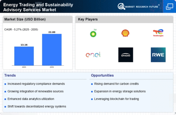 The Energy Trading and Sustainability Advisory Services Market is currently characterized by a dynamic competitive landscape, driven by the increasing demand for renewable energy solutions and the imperative for companies to enhance their sustainability profiles. Major players such as BP (GB), Shell (GB), and TotalEnergies (FR) are actively positioning themselves through strategic initiatives that emphasize innovation and digital transformation. For instance, BP (GB) has been focusing on integrating advanced analytics into its trading operations, which appears to enhance decision-making processes and optimize energy trading strategies. Meanwhile, Shell (GB) is pursuing a strategy of regional expansion, particularly in emerging markets, to capitalize on the growing appetite for sustainable energy solutions. Collectively, these strategies contribute to a competitive environment that is increasingly shaped by technological advancements and a commitment to sustainability.In terms of business tactics, companies are increasingly localizing their operations and optimizing supply chains to enhance efficiency and responsiveness to market demands. The market structure is moderately fragmented, with a mix of established players and new entrants vying for market share. The collective influence of key players is significant, as they leverage their resources and expertise to drive innovation and establish competitive advantages.