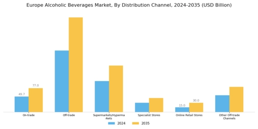 As per Market Research Future Analysis, the Europe Alcoholic Beverages Market was valued at USD 248.52 Billion in 2024 and is projected to grow to USD 383.40 Billion by 2035, with a CAGR of 4.02% from 2025 to 2035. The market is driven by a growing consumer preference for premium products, increased disposable income, and a shift towards healthier drinking options, including low-alcohol and non-alcoholic alternatives. Additionally, sustainability and ethical practices are becoming increasingly important to consumers, influencing production methods across the industry.