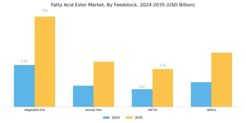 Governments worldwide are implementing regulations that promote the use of sustainable and biodegradable products, which is positively impacting the Global Fatty Acid Ester Market Industry. Policies aimed at reducing environmental footprints are encouraging manufacturers to adopt fatty acid esters in various applications, from industrial lubricants to personal care items. This regulatory support is expected to drive market growth, with projections indicating a market value of 13.9 USD Billion by 2035. As consumers become more environmentally conscious, the alignment of industry practices with regulatory frameworks could enhance market opportunities and foster innovation.