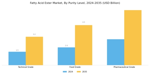 The Global Fatty Acid Ester Market Industry is projected to experience significant growth, with a compound annual growth rate (CAGR) of 7.31% anticipated from 2025 to 2035. This growth trajectory is indicative of the increasing adoption of fatty acid esters across various sectors, including automotive, food, and personal care. As industries continue to seek sustainable alternatives and innovative solutions, the market is likely to expand, driven by both consumer demand and regulatory incentives. The anticipated market value of 13.9 USD Billion by 2035 underscores the potential for investment and development within this dynamic sector.