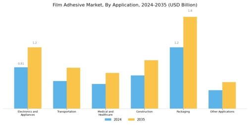 The electronics sector significantly contributes to the growth of the Global Film Adhesive Market Industry. With the increasing miniaturization of electronic devices, the demand for reliable bonding solutions that can withstand thermal and mechanical stresses is paramount. Film adhesives are widely utilized in applications such as circuit boards and displays, where precision and durability are critical. As the electronics industry expands, driven by innovations in consumer electronics and smart devices, the market for film adhesives is expected to flourish. This trend indicates a promising trajectory for the Global Film Adhesive Market Industry, aligning with the projected growth metrics.