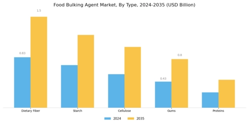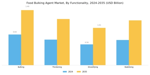 The expansion of emerging markets is a significant driver for the Global Food Bulking Agent Market Industry. As economies develop, there is an increasing demand for processed and convenience foods, leading to a higher consumption of bulking agents. Globalization facilitates the entry of international food brands into these markets, further propelling the demand for bulking agents. This trend is expected to contribute to the overall market growth, with the industry poised to reach 4.96 USD Billion by 2035. The interplay between local preferences and global food trends creates a dynamic environment for bulking agents, indicating a promising future for the market.