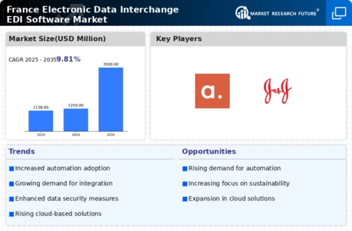 The electronic data interchange software market in France is characterized by a dynamic competitive landscape, driven by the increasing demand for streamlined business processes and enhanced operational efficiency. Key players such as SAP (FR), IBM (FR), and Oracle (FR) are at the forefront, each adopting distinct strategies to solidify their market positions. SAP (FR) focuses on innovation through continuous product development, while IBM (FR) emphasizes partnerships and collaborations to expand its service offerings. Oracle (FR) appears to be concentrating on regional expansion, particularly in sectors like retail and logistics, which are increasingly reliant on EDI solutions. Collectively, these strategies contribute to a competitive environment that is both robust and evolving, as companies seek to leverage technology to meet the growing needs of their clients.
