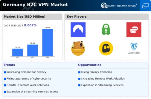 The Germany B2C VPN market is experiencing a notable surge in demand due to escalating cybersecurity concerns among consumers. With increasing incidents of data breaches and cyberattacks, individuals are becoming more aware of the need to protect their online activities. According to recent statistics, approximately 60% of German internet users express anxiety about their personal data being compromised. This heightened awareness drives consumers to seek VPN services that offer robust encryption and privacy features. As a result, VPN providers are adapting their offerings to meet these security demands, thereby contributing to the growth of the Germany B2C VPN market. Furthermore, regulatory frameworks such as the General Data Protection Regulation (GDPR) reinforce the necessity for individuals to safeguard their data, further propelling the adoption of VPN solutions.