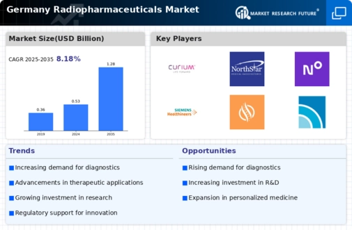 Germany's demographic shift towards an aging population is contributing to a heightened demand for healthcare services, including radiopharmaceuticals. As the elderly population grows, the incidence of age-related diseases such as cancer and cardiovascular conditions is expected to rise. In 2025, approximately 22% of the German population was aged 65 and older, indicating a substantial market for radiopharmaceuticals. This demographic trend is likely to drive the Germany radiopharmaceuticals market, as healthcare providers seek effective diagnostic and therapeutic solutions tailored to the needs of older patients.