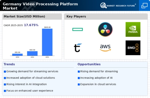 The video processing platform market in Germany is characterized by a dynamic competitive landscape, driven by rapid technological advancements and increasing demand for high-quality content delivery. Key players such as Adobe (DE), Avid Technology (DE), and Blackmagic Design (DE) are at the forefront, each adopting distinct strategies to enhance their market positioning. Adobe (DE) focuses on innovation through continuous software updates and integration of AI capabilities, while Avid Technology (DE) emphasizes partnerships with media companies to expand its reach. Blackmagic Design (DE) leverages cost-effective solutions to attract a diverse customer base, thereby shaping a competitive environment that is both innovative and price-sensitive.