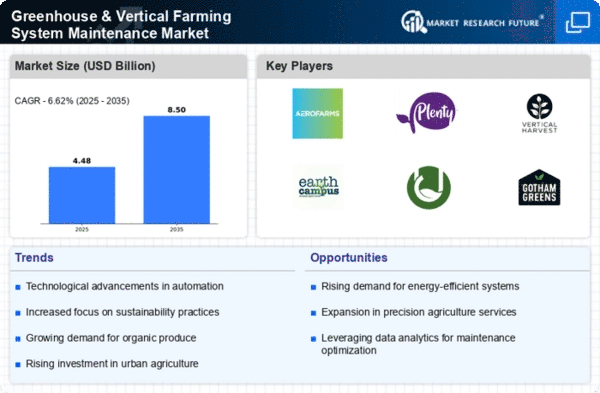 The Greenhouse & Vertical Farming System Maintenance Market is characterized by a dynamic competitive landscape, driven by increasing urbanization, the demand for sustainable food production, and technological advancements. Key players such as AeroFarms (US), Plenty (US), and Infarm (DE) are strategically positioned to leverage these trends. AeroFarms (US) focuses on innovation in aeroponic technology, enhancing crop yields while minimizing resource use. Meanwhile, Plenty (US) emphasizes partnerships with local grocery chains to expand its market reach, thereby integrating its operations into urban supply chains. Infarm (DE) adopts a unique approach by deploying modular farming units in urban areas, which allows for localized production and reduced transportation costs. Collectively, these strategies contribute to a competitive environment that is increasingly focused on sustainability and efficiency.In terms of business tactics, companies are localizing manufacturing and optimizing supply chains to enhance operational efficiency. The market appears moderately fragmented, with several players vying for market share. However, the influence of key players is substantial, as they set benchmarks for innovation and operational excellence. This competitive structure encourages smaller firms to adopt similar strategies, thereby elevating overall market standards.