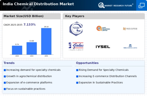 The chemical distribution market in India is characterized by a dynamic competitive landscape, driven by factors such as increasing industrial demand, regulatory changes, and a growing emphasis on sustainability. Major players like BASF (IN), Reliance Industries Limited (IN), and Tata Chemicals Limited (IN) are strategically positioning themselves through innovation and regional expansion. BASF (IN) focuses on enhancing its product portfolio with sustainable solutions, while Reliance Industries Limited (IN) emphasizes digital transformation to optimize its supply chain. Tata Chemicals Limited (IN) is actively pursuing partnerships to strengthen its market presence, collectively shaping a competitive environment that is increasingly focused on sustainability and technological advancement.