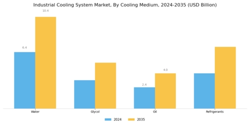 Technological advancements significantly influence the Global Industrial Cooling System Market Industry. Innovations such as evaporative cooling, magnetic refrigeration, and IoT-enabled cooling systems are reshaping the landscape. These technologies not only enhance cooling efficiency but also reduce environmental impact. For instance, IoT integration allows for real-time monitoring and predictive maintenance, optimizing system performance. As industries seek to adopt cutting-edge solutions, the market is poised for growth, with a projected CAGR of 4.74% from 2025 to 2035, reflecting the ongoing evolution of cooling technologies.