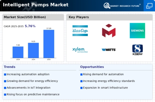 Energy efficiency is a critical driver in the Global Intelligent Pumps Market Industry, as industries seek to minimize operational costs and environmental impact. Intelligent pumps offer enhanced energy management features, allowing for significant reductions in energy consumption. The growing emphasis on sustainability and regulatory compliance is pushing companies to invest in energy-efficient technologies. As a result, the market is projected to grow at a CAGR of 5.77% from 2025 to 2035, potentially reaching 17.2 USD Billion by 2035, as more organizations prioritize energy-efficient solutions.