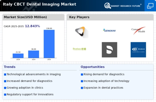 The competitive dynamics within the Italy CBCT dental imaging market are characterized by a blend of innovation, strategic partnerships, and a focus on technological advancements. Key players such as Carestream Dental (US), Planmeca Oy (FI), and Sirona Dental Systems (US) are actively shaping the landscape through their operational strategies. Carestream Dental (US) emphasizes digital transformation and has been enhancing its imaging solutions to integrate seamlessly with practice management software, thereby improving workflow efficiency. Meanwhile, Planmeca Oy (FI) focuses on regional expansion, particularly in Southern Europe, to capture a larger market share, while Sirona Dental Systems (US) is known for its commitment to innovation, frequently launching new products that leverage advanced imaging technologies. Collectively, these strategies contribute to a moderately fragmented market, where competition is driven by technological prowess and customer-centric solutions.