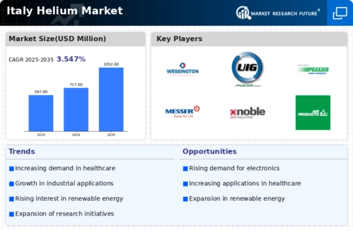 The helium market in Italy is characterized by a competitive landscape that is increasingly shaped by innovation, sustainability, and strategic partnerships. Key players such as Air Liquide (France), Linde (Germany), and Messer Group (Germany) are actively pursuing growth strategies that emphasize technological advancements and operational efficiencies. Air Liquide (France) has focused on enhancing its production capabilities through investments in advanced extraction technologies, while Linde (Germany) has been expanding its service offerings to include more sustainable helium solutions. These strategies collectively contribute to a dynamic competitive environment, where companies are not only vying for market share but also striving to meet evolving customer demands for environmentally friendly practices.