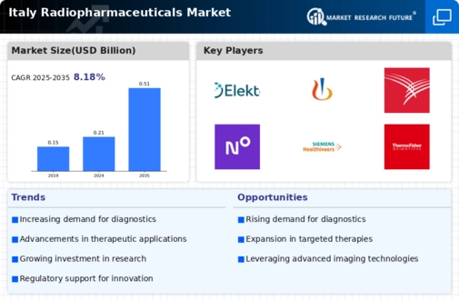 The Italy radiopharmaceuticals market is significantly benefiting from increased investment in research and development (R&D) activities. Italian pharmaceutical companies and research institutions are focusing on developing novel radiopharmaceuticals that cater to specific medical needs. This trend is supported by government initiatives aimed at fostering innovation in the healthcare sector. For instance, the Italian Ministry of Health has allocated substantial funding for R&D projects related to radiopharmaceuticals, which is expected to enhance the pipeline of new products. The emphasis on R&D not only aims to improve existing therapies but also to explore new applications in personalized medicine, thus expanding the market's potential.