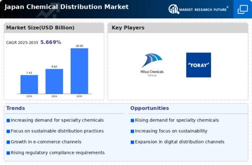 The chemical distribution market in Japan is characterized by a competitive landscape that is both dynamic and multifaceted. Key growth drivers include increasing demand for specialty chemicals, advancements in sustainable practices, and the ongoing digital transformation within the sector. Major players such as Mitsubishi Chemical Corporation (Japan), Sumitomo Chemical Company (Japan), and Asahi Kasei Corporation (Japan) are strategically positioned to leverage these trends. Mitsubishi Chemical Corporation (Japan) focuses on innovation and sustainability, aiming to enhance its product offerings while reducing environmental impact. Sumitomo Chemical Company (Japan) emphasizes regional expansion and strategic partnerships to bolster its market presence, while Asahi Kasei Corporation (Japan) is investing heavily in digital technologies to optimize its operations and supply chain management. Collectively, these strategies contribute to a competitive environment that is increasingly shaped by technological advancements and sustainability initiatives.