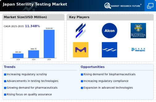 The Japan Sterility Testing Market is projected to grow significantly from 848.7 USD Million in 2024 to 3120 USD Million by 2035.