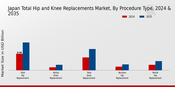 Innovations in surgical techniques are transforming the landscape of the total hip-knee-replacements market. Minimally invasive procedures, robotic-assisted surgeries, and enhanced recovery protocols are becoming more prevalent in Japan. These advancements not only improve patient outcomes but also reduce recovery times, making surgeries more appealing to patients. The market is witnessing a shift towards these advanced techniques, with a reported increase of 15% in the adoption of robotic-assisted surgeries in recent years. As healthcare providers continue to embrace these innovations, This market is likely to experience substantial growth.