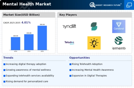 The Global Mental Health Market Industry is characterized by robust growth projections. With an anticipated market value of 194.8 USD Billion in 2024, the industry is on a trajectory towards reaching 300 USD Billion by 2035. This growth is underpinned by a compound annual growth rate (CAGR) of 4.01% from 2025 to 2035. Such projections indicate a sustained demand for mental health services and products, driven by various factors including rising awareness, technological advancements, and government initiatives. The market's expansion reflects a growing recognition of the importance of mental health in overall well-being, suggesting a promising future for stakeholders in this sector.
