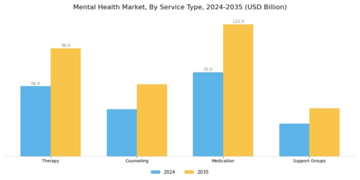 The increasing awareness surrounding mental health issues is a pivotal driver of the Global Mental Health Market Industry. Public campaigns and educational initiatives have contributed to a greater understanding of mental health disorders, leading to reduced stigma and encouraging individuals to seek help. For instance, the World Health Organization emphasizes the importance of mental health awareness, which has resulted in more people recognizing symptoms and pursuing treatment. This heightened awareness is reflected in the projected market growth, with the Global Mental Health Market expected to reach 194.8 USD Billion in 2024, indicating a robust demand for mental health services and products.