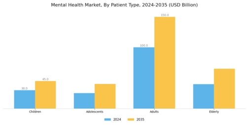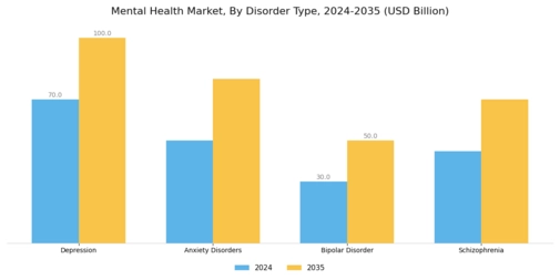 Government initiatives and funding play a crucial role in shaping the Global Mental Health Market Industry. Various countries are implementing policies aimed at improving mental health services, increasing funding for research, and enhancing access to care. For instance, national mental health strategies are being developed to address the rising prevalence of mental health disorders. Such initiatives not only aim to improve public health outcomes but also stimulate market growth by increasing the availability of mental health resources. As a result, the Global Mental Health Market is anticipated to reach 300 USD Billion by 2035, underscoring the impact of governmental support on industry expansion.