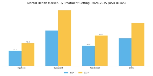 The integration of technology into mental health services represents a transformative trend within the Global Mental Health Market Industry. Teletherapy, mobile applications, and online support groups are becoming increasingly prevalent, providing accessible mental health resources to a broader audience. For example, platforms that offer virtual therapy sessions have gained traction, particularly among younger demographics who prefer digital solutions. This technological shift is likely to enhance service delivery and patient engagement, contributing to the market's expansion. As the industry evolves, the Global Mental Health Market is projected to grow at a CAGR of 4.01% from 2025 to 2035, reflecting the ongoing integration of innovative solutions.