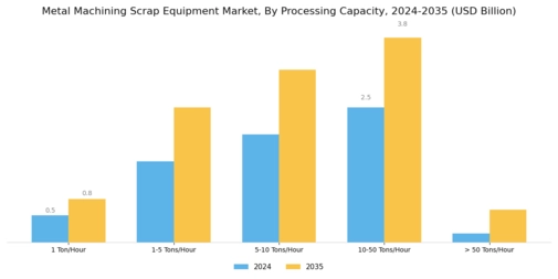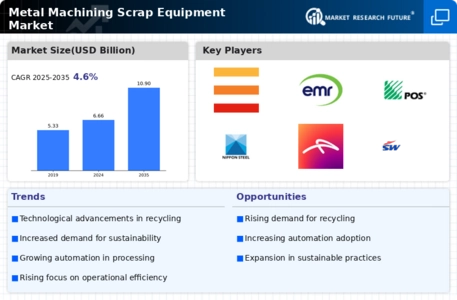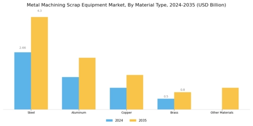 Technological innovation plays a pivotal role in shaping the Global Metal Machining Scrap Equipment Market Industry. The introduction of automated and smart machinery enhances efficiency and productivity in scrap processing. For example, advancements in sensor technologies and artificial intelligence enable real-time monitoring and optimization of operations. This not only reduces operational costs but also improves the quality of recycled materials. As industries increasingly adopt these technologies, the market is likely to witness substantial growth, potentially reaching 10.9 USD Billion by 2035. The integration of advanced technologies is expected to streamline operations, making metal recycling more attractive to manufacturers.
