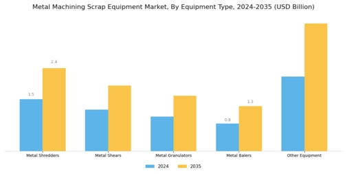 Government policies and regulations significantly influence the Global Metal Machining Scrap Equipment Market Industry. Many countries are implementing stricter regulations on waste management and promoting recycling initiatives. For instance, governments may offer incentives for companies that invest in recycling technologies or adhere to sustainable practices. These regulations encourage industries to adopt metal scrap equipment, thereby increasing market demand. As a result, the market is projected to grow at a CAGR of 4.56% from 2025 to 2035. This regulatory landscape not only supports environmental goals but also fosters innovation in the scrap equipment sector.