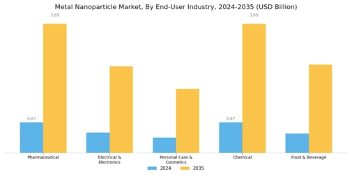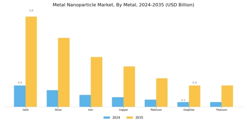 The Global Metal Nanoparticle Market Industry is significantly influenced by advancements in medical applications. Metal nanoparticles are increasingly employed in drug delivery systems, diagnostics, and imaging techniques. For instance, gold nanoparticles are utilized for targeted cancer therapies, enhancing the efficacy of treatments while minimizing side effects. The growing focus on personalized medicine and the need for innovative therapeutic solutions are likely to propel market growth. As the healthcare sector continues to evolve, the Global Metal Nanoparticle Market Industry is expected to expand, with a compound annual growth rate of 14.05% projected from 2025 to 2035, indicating a robust future for metal nanoparticles in medical technologies.