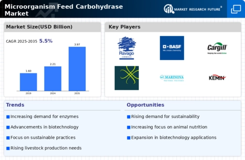 Technological innovations in enzyme production are significantly influencing the Global Microorganism Feed Carbohydrase Market Industry. Advances in fermentation technology and genetic engineering have led to the development of more efficient and cost-effective carbohydrases. These innovations not only enhance enzyme activity but also improve stability under various conditions, making them more suitable for diverse feed formulations. As a result, livestock producers are increasingly adopting these advanced enzymes to optimize feed formulations. The market is expected to grow at a CAGR of 5.46% from 2025 to 2035, indicating a robust future driven by ongoing technological progress.