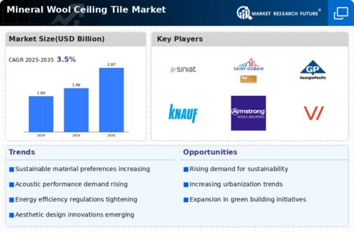 The Global Mineral Wool Ceiling Tile Market Industry experiences a notable surge in demand for sustainable building materials. As environmental concerns escalate, architects and builders increasingly favor materials that offer energy efficiency and sustainability. Mineral wool, known for its excellent thermal and acoustic insulation properties, aligns with these preferences. This trend is particularly pronounced in regions with stringent building regulations aimed at reducing carbon footprints. The market is projected to reach 1.96 USD Billion in 2024, reflecting a growing inclination towards eco-friendly construction practices. Consequently, the Global Mineral Wool Ceiling Tile Market Industry is likely to expand as more stakeholders prioritize sustainability in their projects.