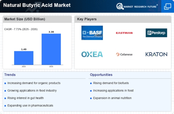 The Natural Butyric Acid Market is significantly influenced by the expansion of the animal feed sector. As livestock producers seek to enhance animal health and productivity, the incorporation of natural additives like butyric acid is becoming more prevalent. This compound is recognized for its ability to improve gut health in animals, leading to better feed efficiency and growth rates. Recent market analysis suggests that the use of butyric acid in animal feed has increased by around 20% over the past few years, driven by the demand for sustainable and health-oriented livestock production. Consequently, the growth of the animal feed industry is expected to bolster the Natural Butyric Acid Market, creating new opportunities for manufacturers.
