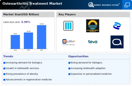 The increasing incidence of osteoarthritis globally is a primary driver of the Global Osteoarthritis Treatment Market Industry. As populations age, the prevalence of osteoarthritis is expected to rise significantly. For instance, by 2024, the market is projected to reach 10.0 USD Billion, reflecting the growing demand for effective treatment options. The World Health Organization indicates that osteoarthritis affects millions worldwide, leading to a substantial burden on healthcare systems. This trend suggests that healthcare providers will need to focus on innovative therapies and management strategies to address the needs of this expanding patient population.